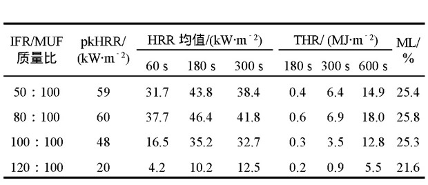 表2 IFR/MUF質量比對MDF試樣釋熱和質量損失的影響