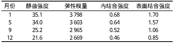 不同時間中密度板力學(xué)性能具體數(shù)值見表1。
