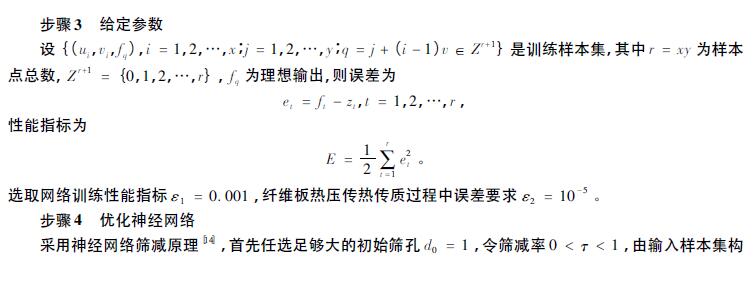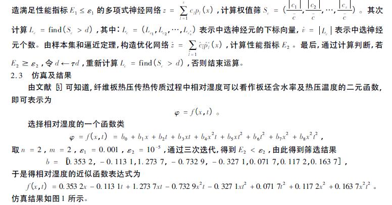 文獻(xiàn) 研究了非線性熱傳導(dǎo)方程中未知系數(shù)的反演問題,采用中心差分離散方程得到迭代矩陣,通過建立牛頓迭代格式求解迭代增量,反演出方程中未知系數(shù)。文獻(xiàn)運(yùn)用分離變量法、齊次化原理、定義算子的方法,求解了微波加熱過程中木材內(nèi)部溫度的熱傳導(dǎo)模型中熱源的近似解析解。本文利用多輸入單隱層神經(jīng)網(wǎng)絡(luò)逼近多項(xiàng)式方法及文獻(xiàn)的理論,參考中密度纖維板熱壓干燥過程中的溫度及濕度傳遞規(guī)律,結(jié)合中密度纖維板的構(gòu)造特點(diǎn)以及與纖維板傳熱相關(guān)的物理性質(zhì),通過訓(xùn)練已有的實(shí)驗(yàn)數(shù)據(jù),利用單隱層前向神經(jīng)網(wǎng)絡(luò)對纖維板熱壓過程中木材內(nèi)部溫度、濕度以及含水率之間的函數(shù)關(guān)系進(jìn)行參數(shù)識別,該模型能夠直觀地反映纖維板熱壓干燥過程中相對濕度與熱壓溫度及含水率之間的函數(shù)關(guān)系,實(shí)現(xiàn)對板坯含水率的定量分析,因此對纖維板干燥過程中的質(zhì)量控制有一定的指導(dǎo)作用;在分析纖維板熱壓過程中纖維板內(nèi)部傳熱傳質(zhì)規(guī)律的基礎(chǔ)上,建立相關(guān)的熱濕模型,從定量的角度去分析問題,為實(shí)際應(yīng)用提供數(shù)值化直觀數(shù)學(xué)模型。