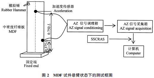 為自由狀態下MDF 的動態彈性模量和剪切模量測試框圖。用牛皮筋懸掛MDF 試件,實現自由 支撐梁方式,加速度計置于距MDF 單側0.375L處; 通過橡皮錘敲擊試件,觸發采集信號,實現兩次敲 擊取平均值,軟件中顯示出頻譜,通過動態信號頻譜分析,識別一彎和一扭頻率,測算得出材料彈性模量及剪切模量,對每塊試件重復測量3次。