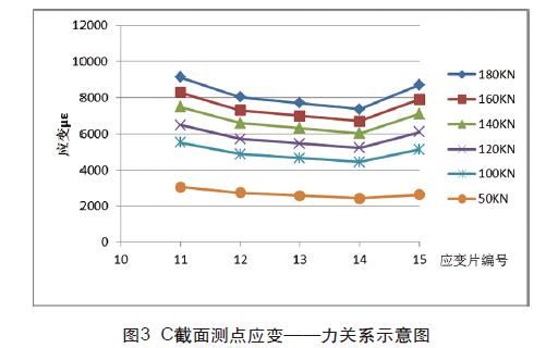 圖中橫坐標為測點應變片編號,縱向坐標為應變值。從圖1、 圖2、圖3各個截面的數據比較可以看出,在錨具張拉出口端附近 的A截面與C截面,邊部纖維應力與中部纖維應力應變差較大,對 3個截面的數據進行分析,靠近錨具端的A、C截面應變差總是會 大于中間B截面應變差,而B截面邊部纖維與中部纖維的應變值差 基本可忽略不計,也就說明了在遠離碳密度板錨固處附近之后, 截面應力分布就趨近于均勻,錨具端的泊松效應分影響布就可以 忽略不計了。