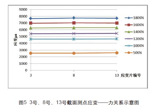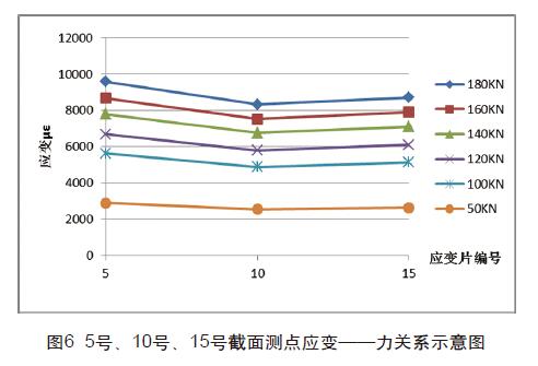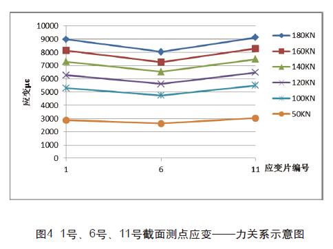 如上圖4、圖6所示: 1號、5號應變片、11號、15號應變片 應力比中部應力大,這表明錨固端對錨固區有一定的影響,當力 達到180KN時,兩端的應力比中部的應力明顯大一些。也表明力 越大,端部影響就越大。這也近一步說明在錨具張拉出口端附近 CFRP板的應力分布較為復雜,應力分布并不像遠離邊界部位的 應力那樣分布均勻。圖5所示,該截面上應力分布較均勻,應變差 基本可忽略不計,表明中心截面受碳纖維邊緣和錨具端附近影響 較小,能充分發揮出中部碳密度板的性能。