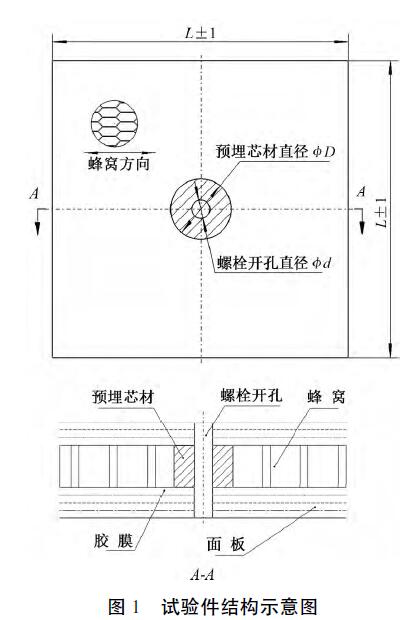 復合材料蜂窩夾層結構一般由上下面板、芯材、粘接層等組成,其上鑲嵌有埋件,形成傳力接頭。埋件結構是結構設計中廣泛使用的連接形式,是蜂窩結構與其他結構連接時的主要受力部件。根據制備工藝的不同,埋件分為預埋件和后埋件,埋件多使用金屬埋件,多采用后埋工藝。目前埋件夾層結構的破壞機理尚不明確,埋件的拉脫強度一般通過試驗獲得。