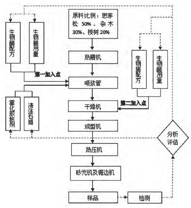 在實際生產規模中, 驗證生物酶應用的概念、正面效果及可能產生的生物酶過敏源, 對生物酶用量、生物酶配方在不同膠用量的情況下進行評估, 確認降膠量的潛力。在不降低板材強度及工藝控制的情況下, 重點評估了降膠量的潛力, 通過更進一步的用量優化及配方調整, 經濟價值也得到了體現, 并且操作容易控制, 生物酶應用方案與設備持續優化, 如圖1。